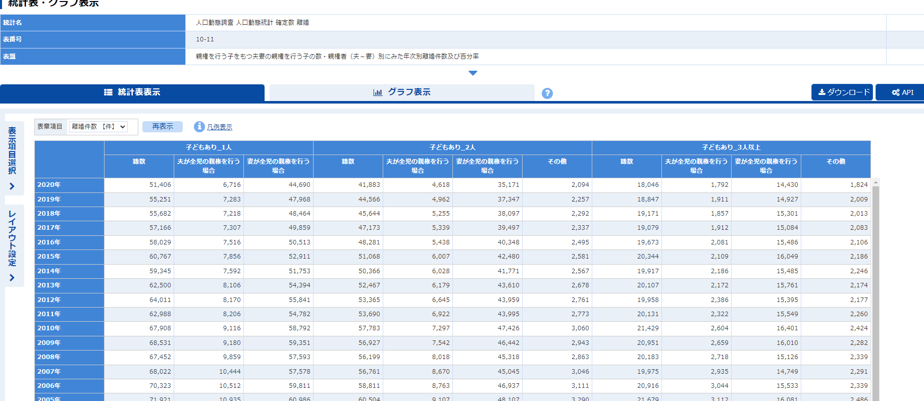 実はe-statという政府の統計サイトで日本の離婚数推移と親権が父親/母親どちらになったかというデータが開示されています。